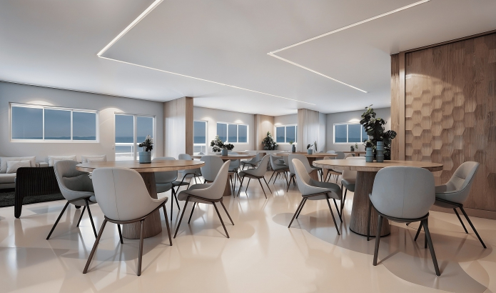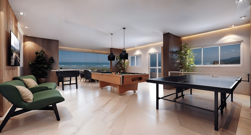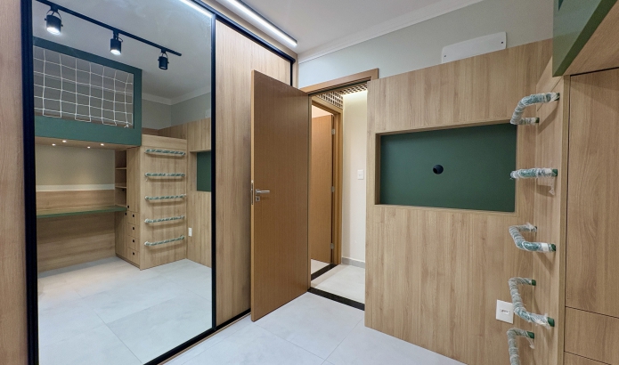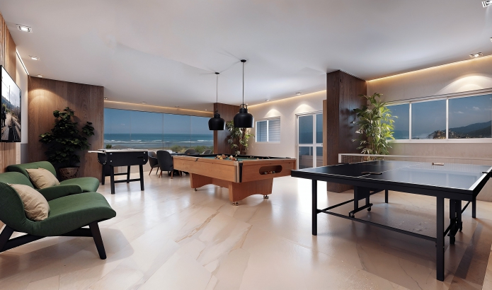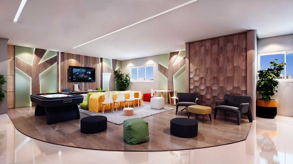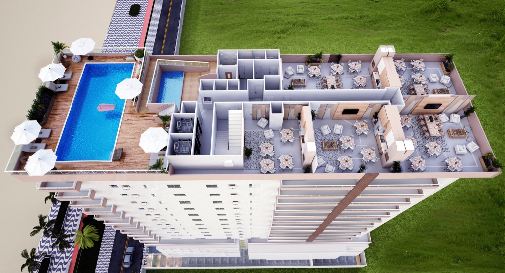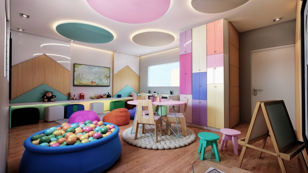 Área de Lazer: Lazer Completo no Mezanino e na Cobertura Contendo: - Piscina Adulto e Infantil (cobertura) - Salão de Festas - Salão de Jogos Adulto - Salão de Jogos Juvenil - Salão de Jogos Infantil - Brinquedoteca - Espaço Fitness - Sauna - Pet Care - Salão de Beleza - Espaços Gourmet na Cobertura - Armários Home Box