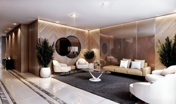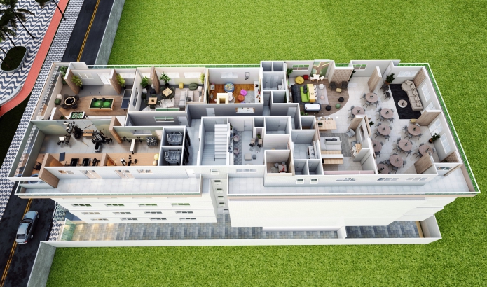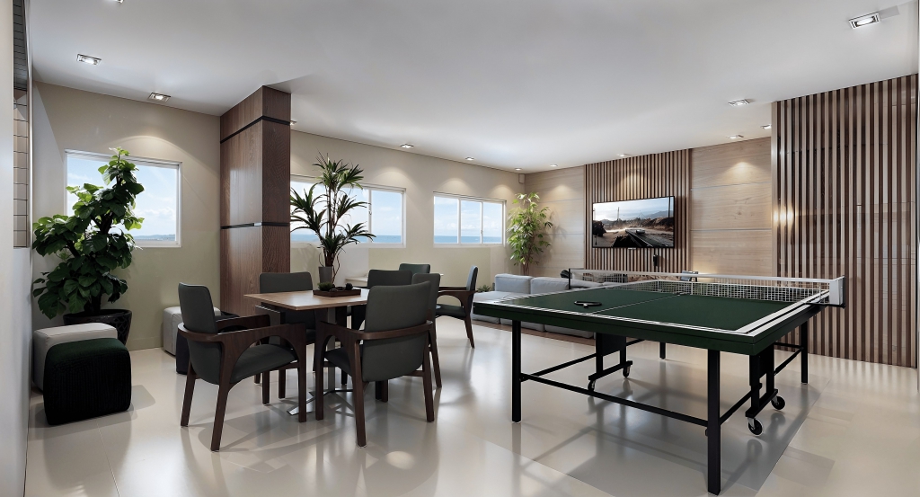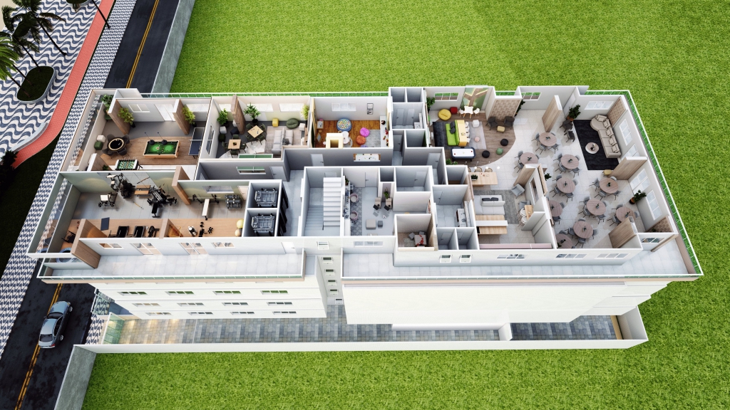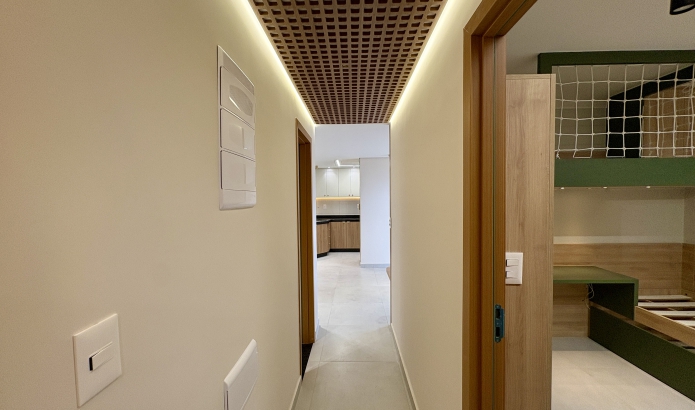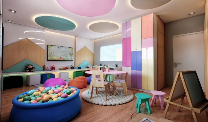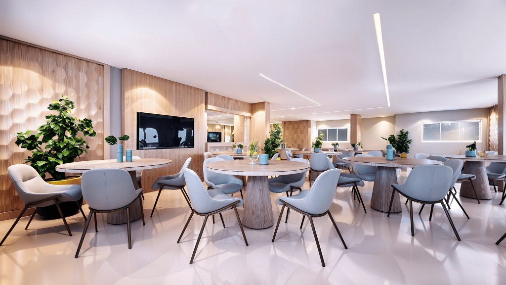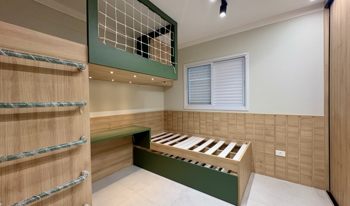 Área de Lazer: Lazer Completo no Mezanino e na Cobertura Contendo: - Piscina Adulto e Infantil (cobertura) - Salão de Festas - Salão de Jogos Adulto - Salão de Jogos Juvenil - Salão de Jogos Infantil - Brinquedoteca - Espaço Fitness - Sauna - Pet Care - Salão de Beleza - Espaços Gourmet na Cobertura - Armários Home Box